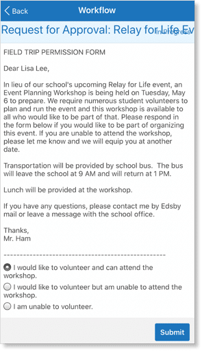 Field trips, school opportunities, and requests for volunteers are all simplified using Edsby’s Approvals feature. Edsby Approvals enable teachers to send requests directly to students and teachers will receive a list of students who have responded as soon as they do. Edsby Approvals does not let permission slips get lost at any point during the process as they are kept secure within Edsby.