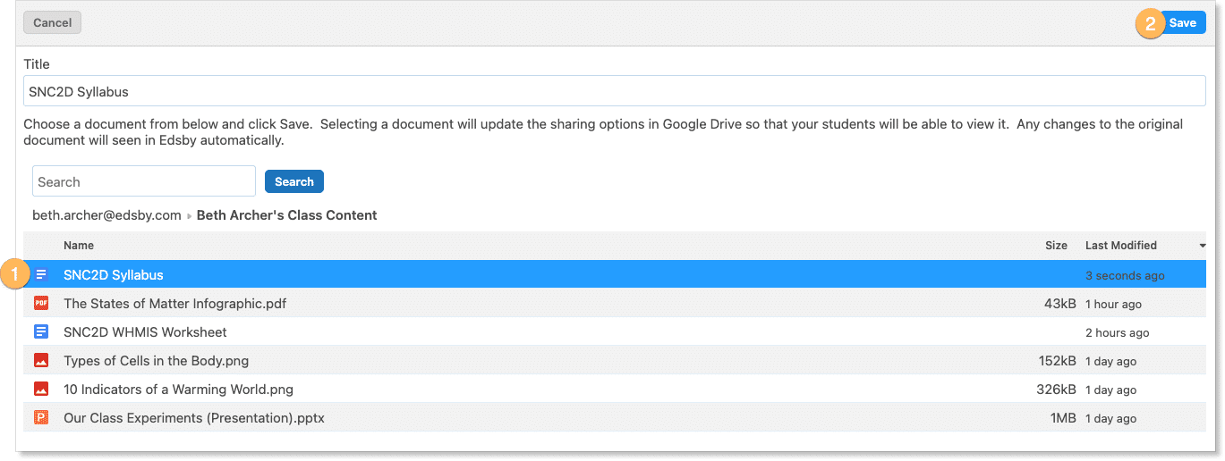The contents of a teacher’s account will appear in the right panel of the Content Builder. Teachers can select the document they wish to link. In this illustration, the teacher is linking the class syllabus for her students to view. Click Save.