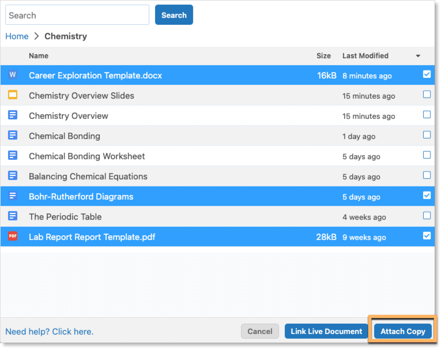 Choosing Attach Copy will copy the selected items. The items can be downloaded or viewed within Edsby.