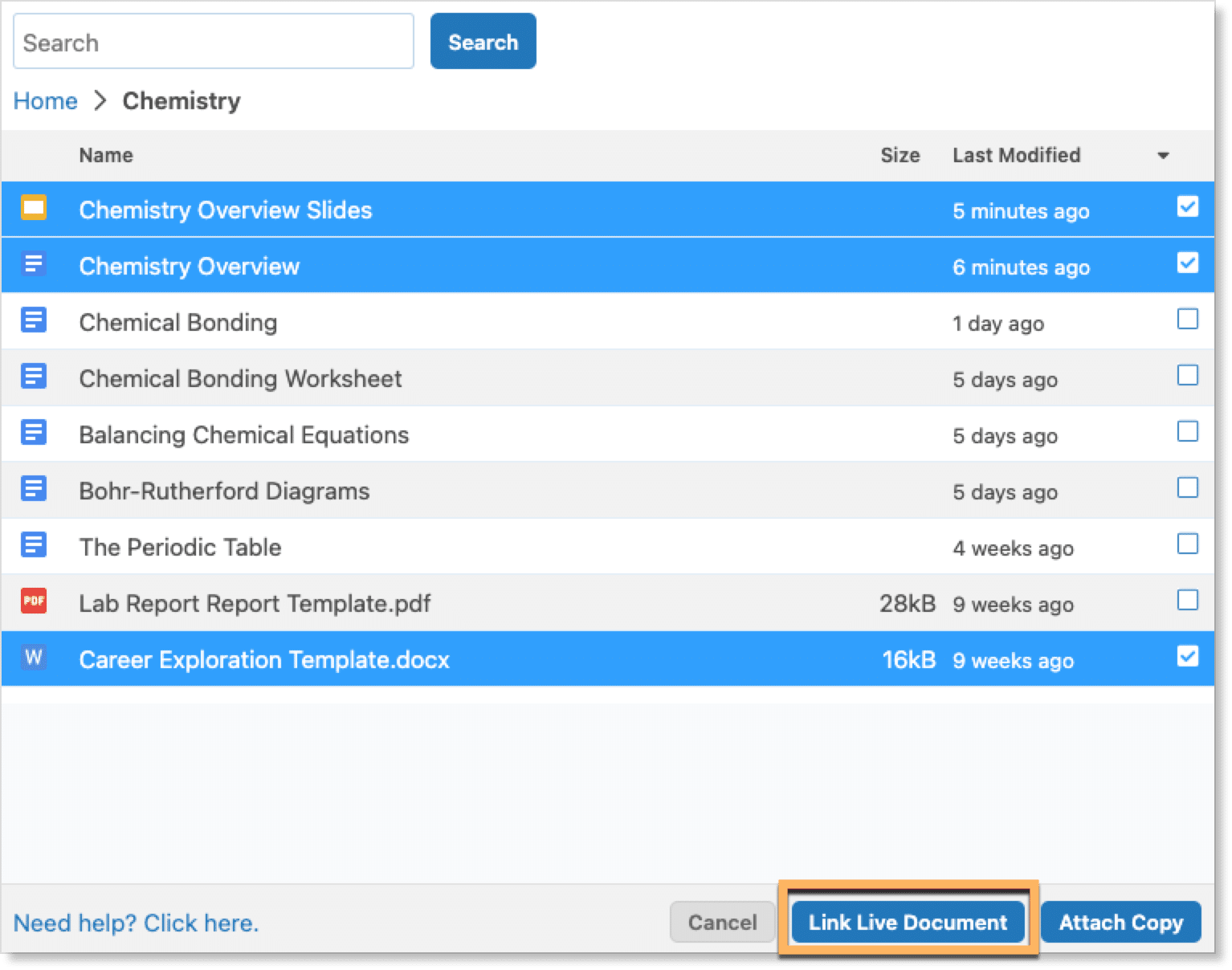 Selecting Link Live Documentwill create links to the selected documents. Clicking on any of these links will open the current version of the item in a new browser window. Any changes made to the document in its original location will be reflected within Edsby.