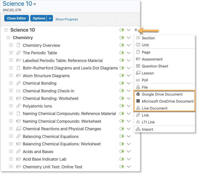 To add a live link to a document in the Content Builder, click the + and select one of Google Drive Document, Microsoft OneDrive Document, or Live Document.