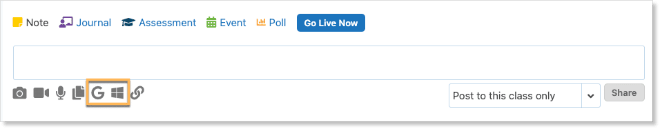 Edsby’s many features are equipped to import and update live documents linked from Google Drive, Microsoft OneDrive, or an external service. Live documents can be directly imported into the Content Builder in Classes and Groups. Additionally, Notes, Journals, Assessments, Polls, Calendars, Events, and Messages all include the Google Drive and Microsoft OneDrive icons. Wherever the Google and Microsoft icons are displayed in Edsby, live documents can be uploaded.
