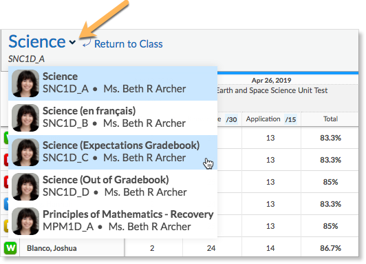 Teachers can navigate between classes they teach from any screen. Click the drop-down arrow to view the list of classes the teacher teaches. When a teacher navigates to another class, the current view stays for the new class. For example, if the teacher is in the Gradebook, they can navigate to Gradebooks of their other classes. If they are in the course plan, they can navigate to other course plans.