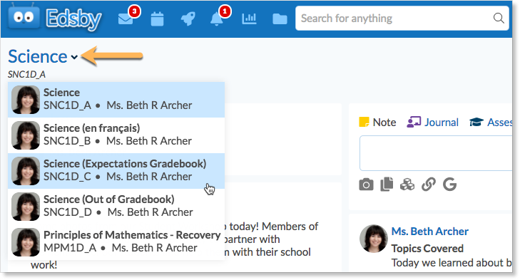 Teachers can navigate to the feed of other classes they teach by clicking the drop-down arrow next to the name of their current class in the class feed and selecting a new class.