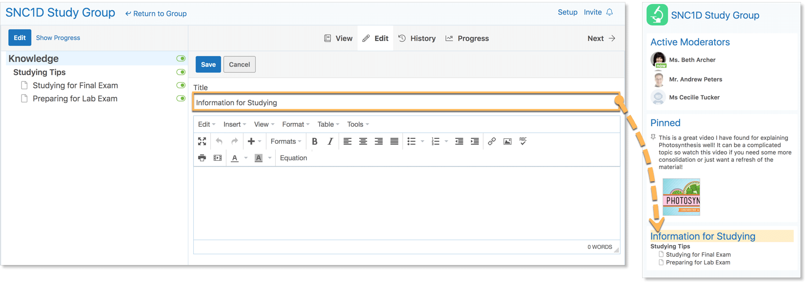 Here, teachers can change the title. In this example, the Knowledge Base in the SNC1D Study Group is being changed to say ‘Information for Studying’.
