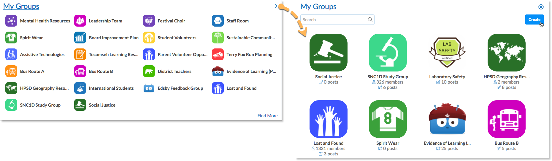 To create a Study group, click the pop-out in the My Groups panel or click Find More at the bottom of the My Groups panel. Click Create.