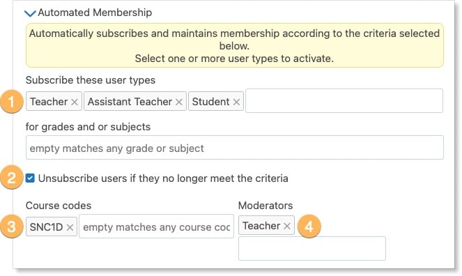- Moderators can be assigned to the group on a role basis. In this example, teachers teaching SNC1D will automatically become moderators of the Study group.
