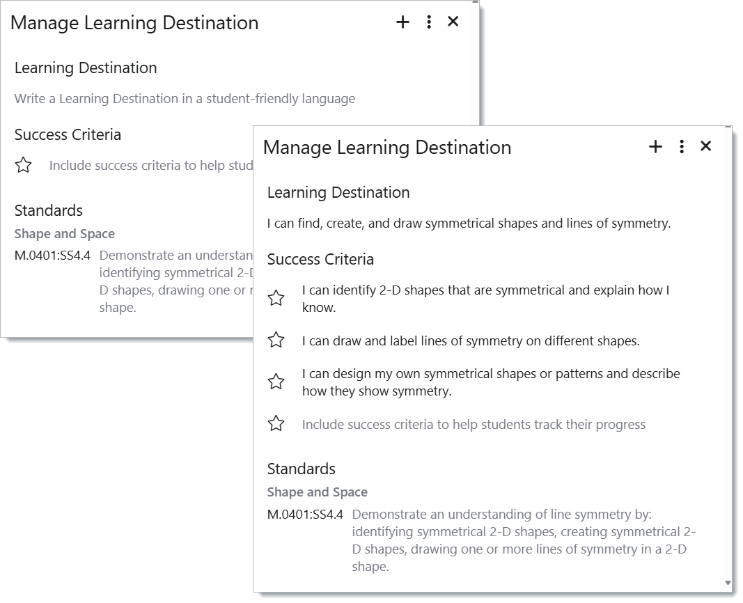If text is not inputted for the Learning Destination, the Strand/Outcome will show in italics as it appears in the curriculum. The Destination card will initially appear as the Strand name and then the Standard text in italics.