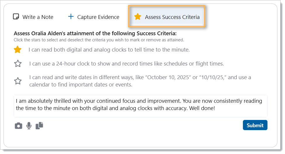 Removing a success criteria’s ‘complete’ status and re-applying it at a different date will change the attainment date to the most recent one. Teachers also have the ability to remove previously set attainments on any criteria.
