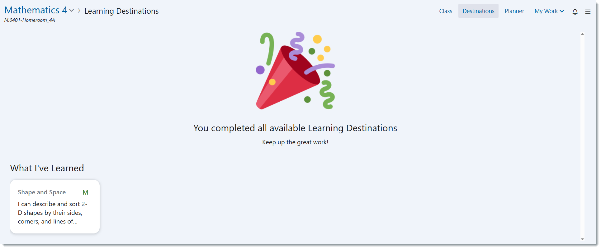 Once a student has attained the destination, the destination card will move from the ‘What I’m Learning’ category to the ‘What I’ve Learned’ category, as shown down below.
