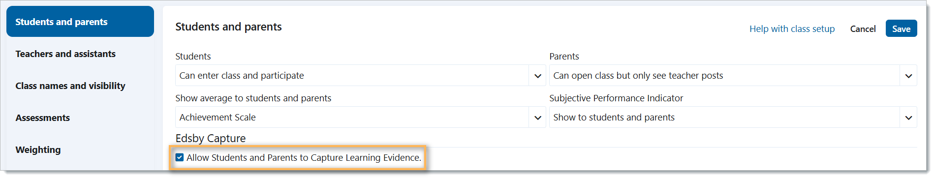 *Note: In order for students to be able to capture their learning, students must have the permission to capture evidence. This can be turned on in the class settings. (Settings → Setup → Students and Parents → Check off ‘Allow Students and Parents to Capture Learning Evidence’. Don’t forget to save!)