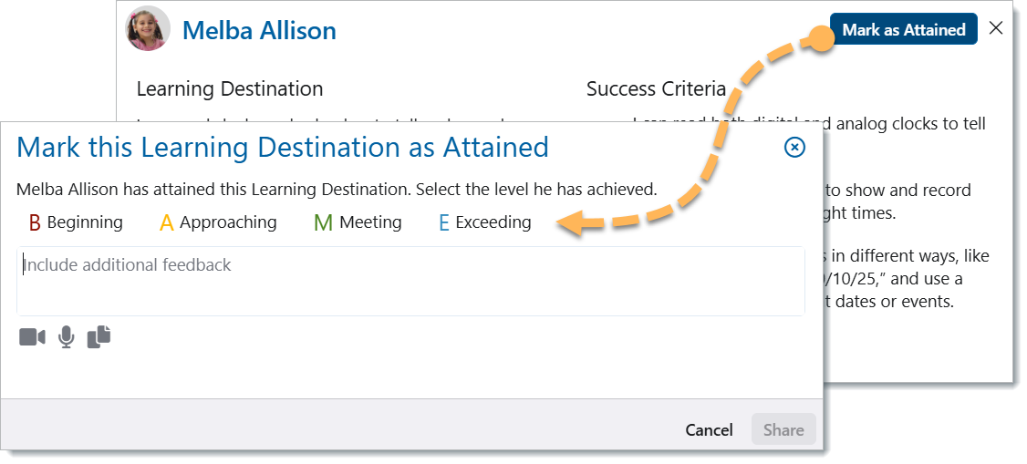 When clicking the ‘Mark as Attained’ button for a specific destination, teachers will need to select the level that the student has achieved. That level of attainment selected will only be applicable to the specific learning destination currently being assessed. Destinations can only be marked as attained from the actual destination. The options to select from when marking a student’s destination as attained are typically set by your school’s district. When marking a destination as attained, teachers also have the option to add a comment to support their decision; however, this is optional.