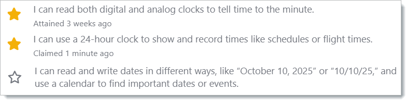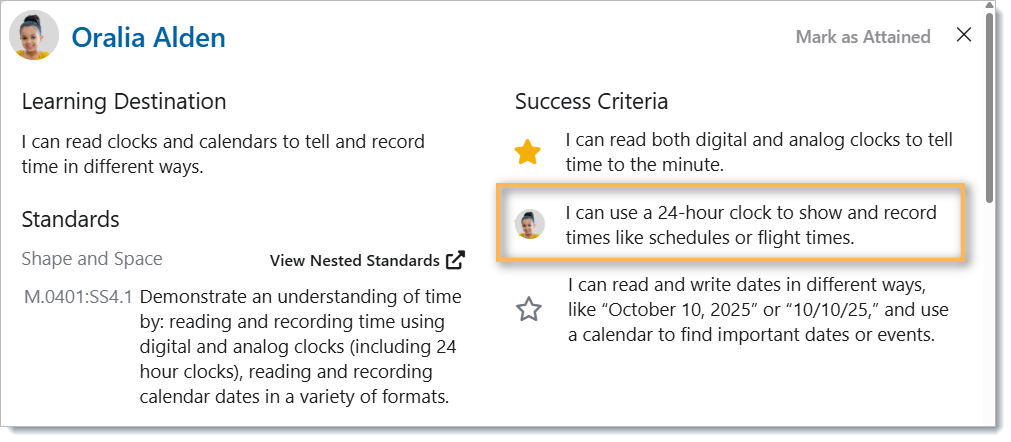 When students claim that they have completed the success criteria, the student’s profile picture will appear where the stars typically appear, as shown below. In this example, we can see that the student has claimed that they have achieved the success criteria that says “I can use a 24-hour clock to show and record times like schedules or flight times”.