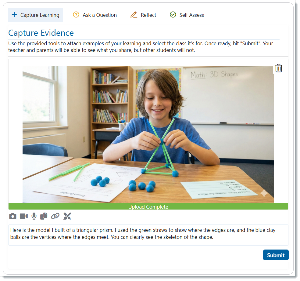 To capture learning for a destination, the student must click the ‘+ Capture Learning’ button. This will permit the student to submit a form of media, whether it be a photo, video, voice note, a file, a link, or an artboard. When capturing learning, students will have to add a reflection to their learning before they can submit. This can be a short description of what they are submitting or something else related to what they are submitting. The class section of the capture learning category will be automatically selected based on the class they are currently logged into.
