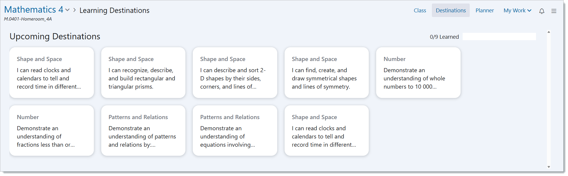 If destinations are not written in student-friendly language, the destinations will appear as the strand name, as in the curriculum.