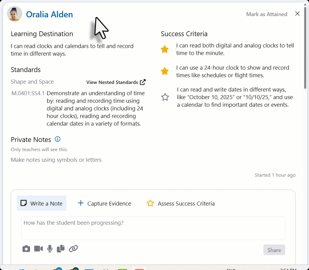 Once the destination is attained, a time stamp will appear at the bottom of the destination card, beside the time stamp of when the student started working on the destination. The success criteria become locked once the student has attained the destination. To unlock the success criteria, teachers will need to remove the attainment. This can be done by clicking the attainment.