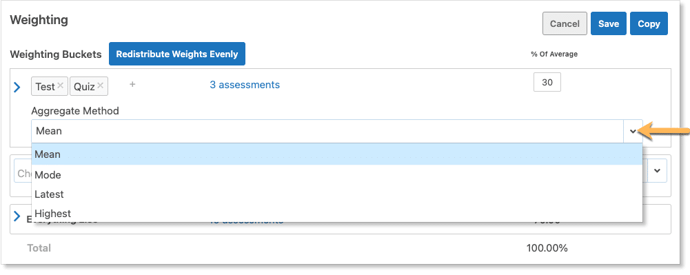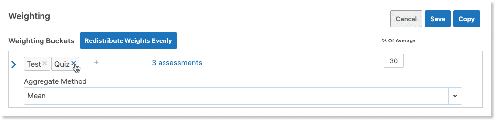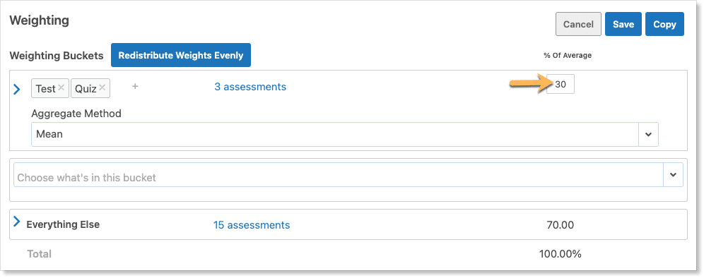 Teachers can create buckets based on the assessments type. Existing and future assessments are placed into the bucket. For example, tests and quizzes can be put in the same bucket and given a weight of 30%.