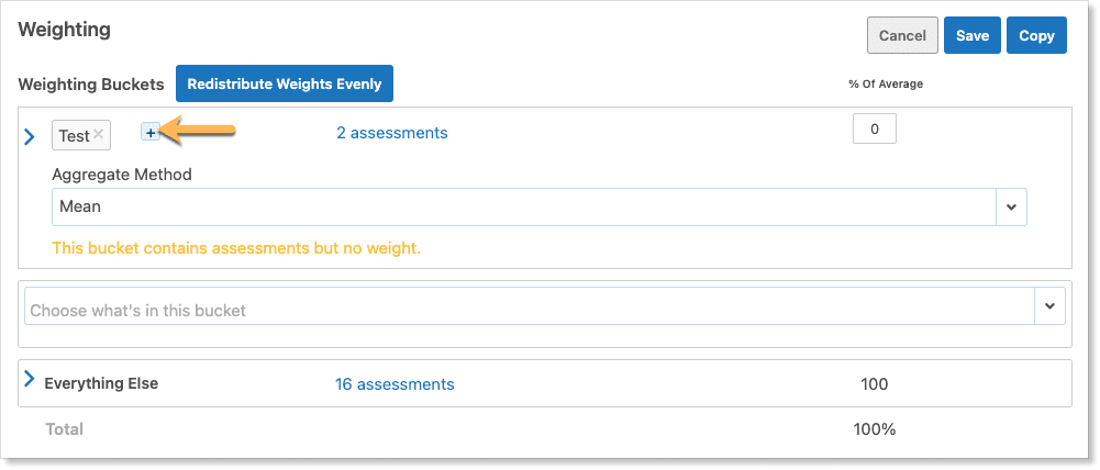 The teacher has created a set of buckets that account for 100% of the grade, but 12 assessments exist that don’t match any of the above buckets. The assessments are added to Everything Else and display a warning: “This bucket contains assessments but no weight”.