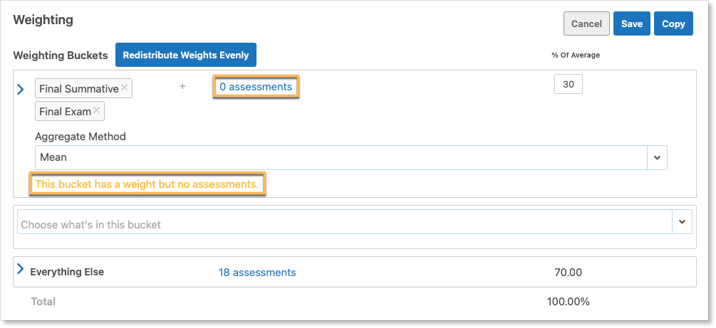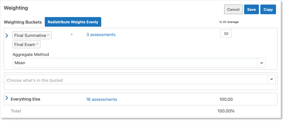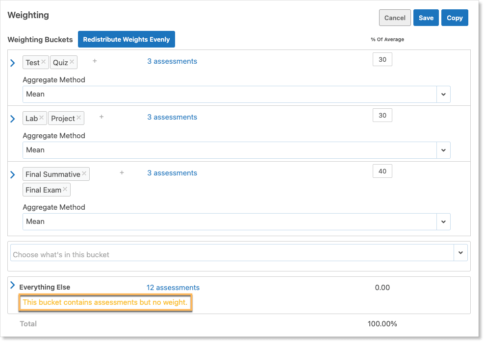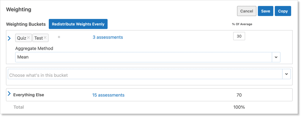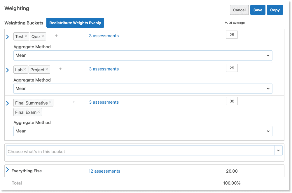 In this example, tests and quizzes are grouped together, as are projects and labs. The third bucket has been created for the final assessments.