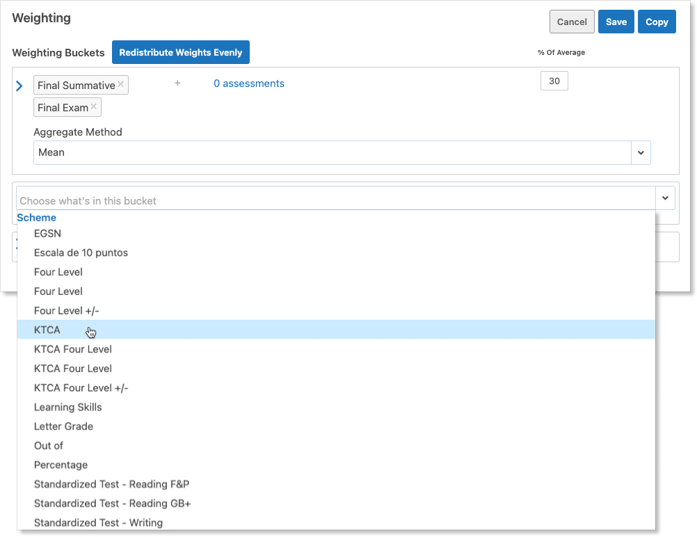 Every assessment including the two finals assessments use the KCTA grading scheme. The final assessments also have an assessment type of Final Exam and Final Summative. The two final assessments can go in either bucket, so teachers need to make a choice.