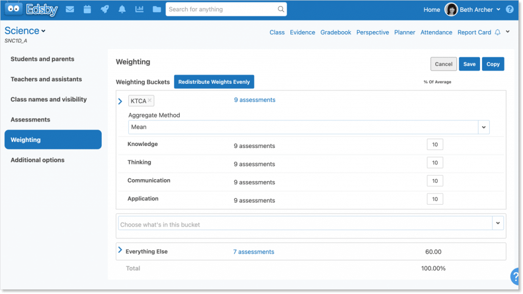 In addition to the weighting points, each assessment has an assessment type and Edsby can use the type to automatically place current and future assessments into buckets of the teacher’s choosing. Once teachers have created buckets, all assessments will be added to the correct bucket and no further work is required.