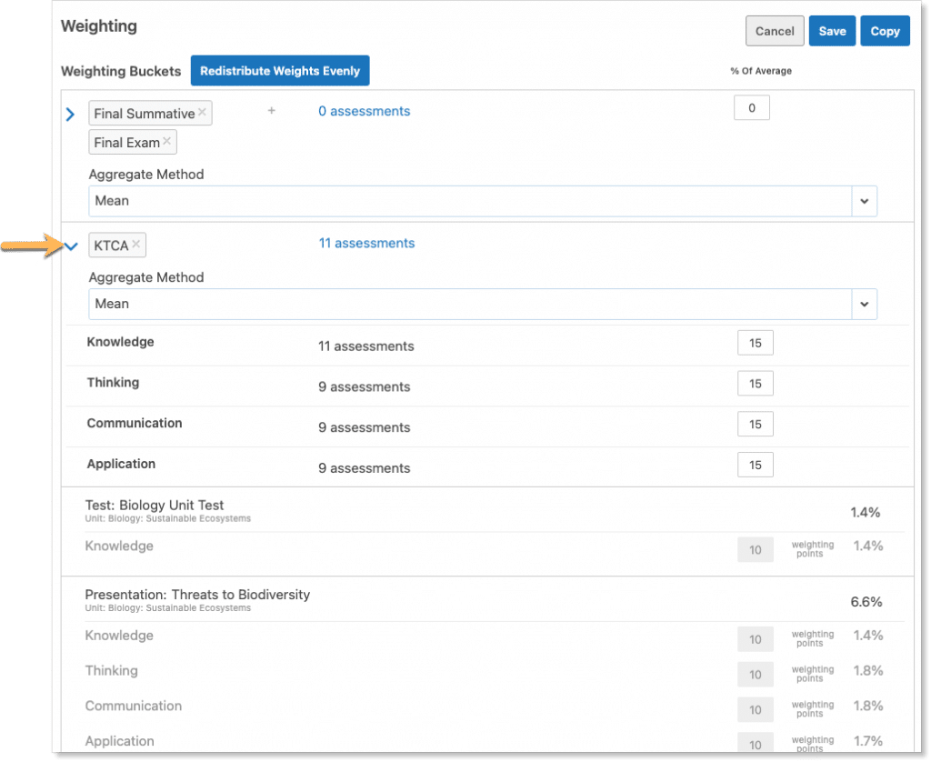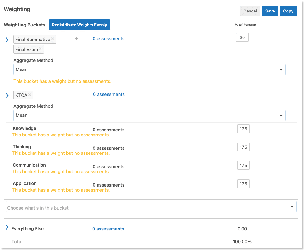 In this example, Edit Weighting was set before any assessments have been created so the form displays: “This bucket has a weight but no assessments”. As the teacher creates assessments with a KCTA grading scheme, they will be added to the KCTA bucket. The bucket with Final Summative and Final Exam assessments will display “This bucket has a weight but no assessments” until assessments with that assessment type are created.