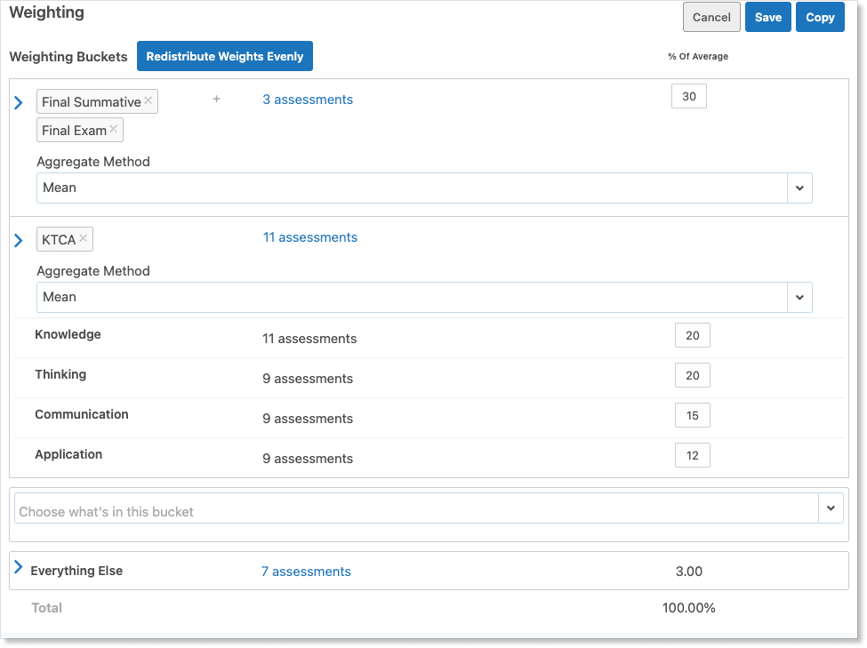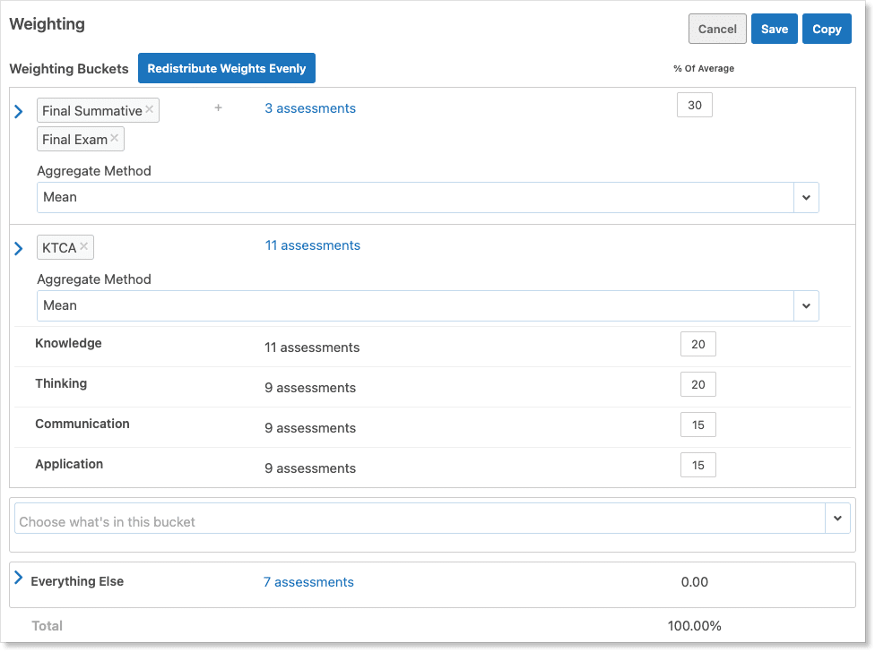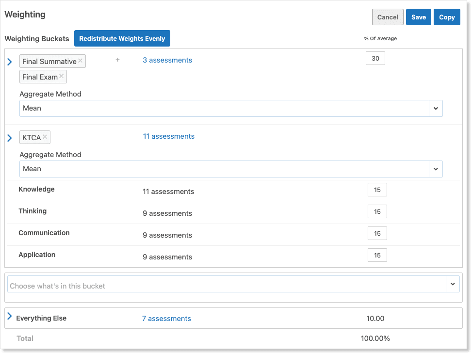 By default, all summative assessments are grouped together in the Everything Else bucket and the percentage of Final Average is 100%. Formative assessments are not used in calculating averages. Creating a KCTA bucket will move every assessment with a KCTA grading scheme into the bucket. Only assessments that do not have a KCTA grading scheme will remain in the Everything Else bucket.