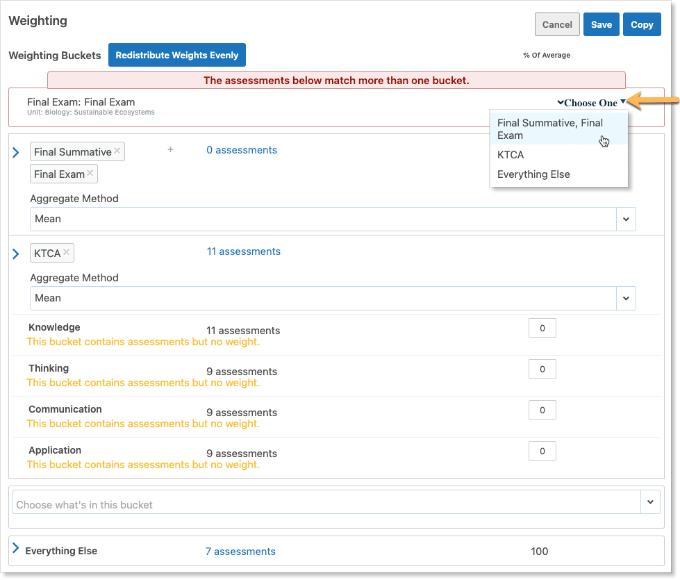 Click Choose One and select the desired bucket. In this example, the two assessments were added to Final Summative, Final Exam bucket.