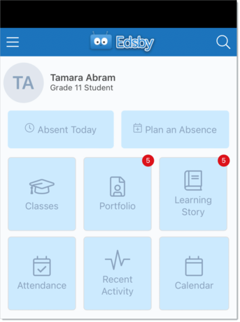 Each student has their own Edsby Portfolio, which is similar to a personal blog. In the Portfolio, students create posts about themselves and their academic or extracurricular success. Parents can view their child’s Portfolio as a feed by clicking Portfolio on the Home Screen under the child’s name.
