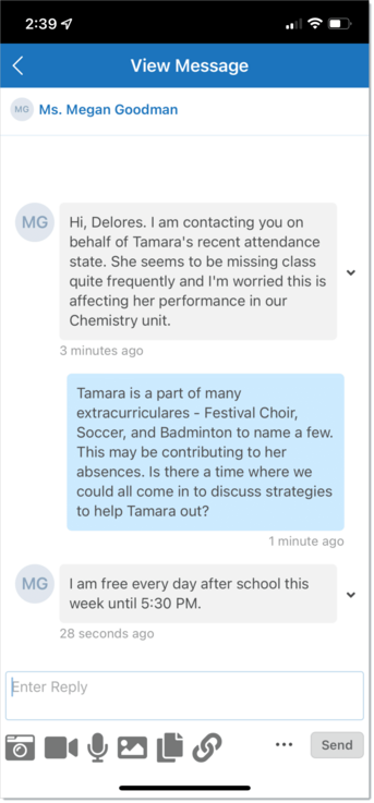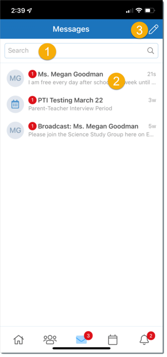 Parents can view messages by clicking the Messages icon in the navigation bar across the bottom of the screen.