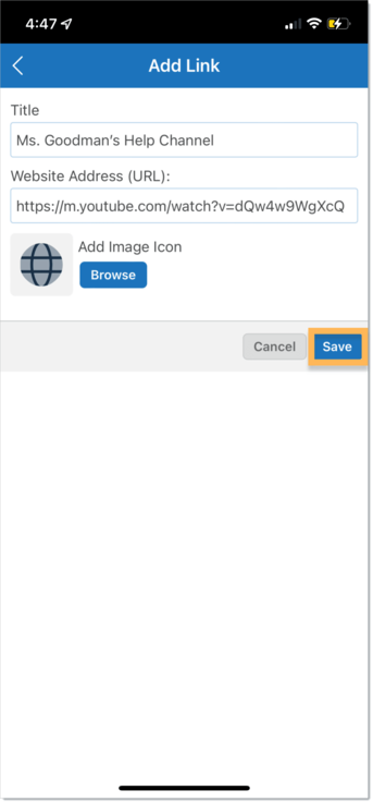 Give the link a title and paste the website address in the URL box. Add an optional image icon by clicking Browse. Click Save.