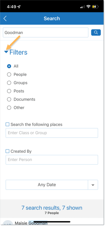 To refine a search, click the blue button at the bottom of the search options. Searches can be filtered to search through People, Groups, Posts, Documents, or other. Parents can also specify which group to search in or search by who created the content. Additionally, the date range can be refined to narrow down the search.