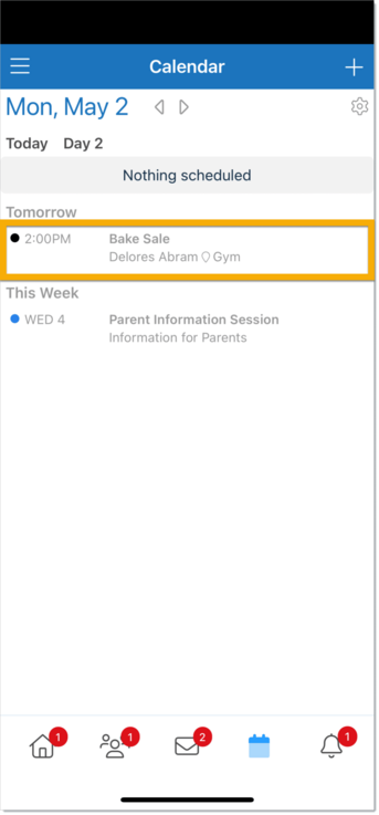 Clicking the Calendar icon from the bottom navigation bar brings a parent to the Personal Calendar.
