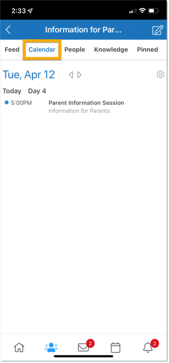 Click Calendar in the top menu bar of a Group to view past, current, and upcoming events specific to the selected Group.