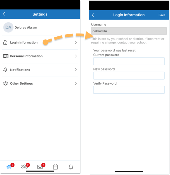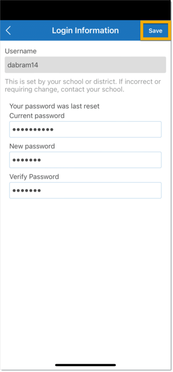 If this information is incorrect or requires updating, parents should contact the school. However, parents can change their passwords themselves. Type in the new password in Settings > Login Information and confirm it by typing it again under Verify Password. Click Save.