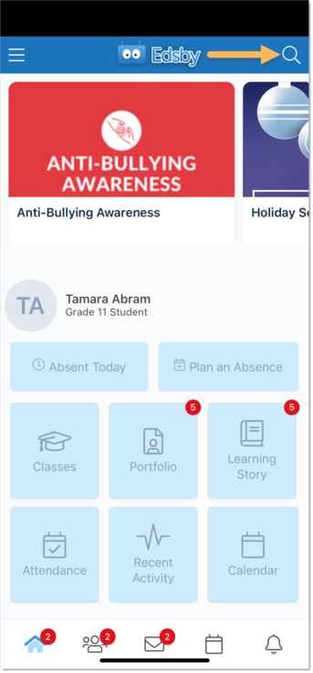 Parents can search for people, Groups, or anything else in Edsby by clicking the Search icon in the top right corner of the Home Screen.