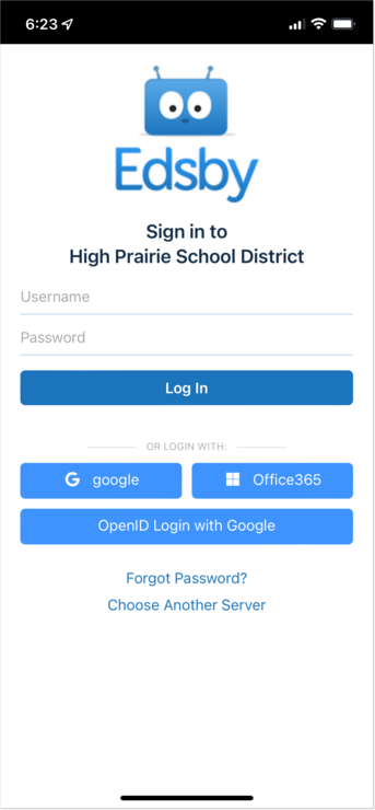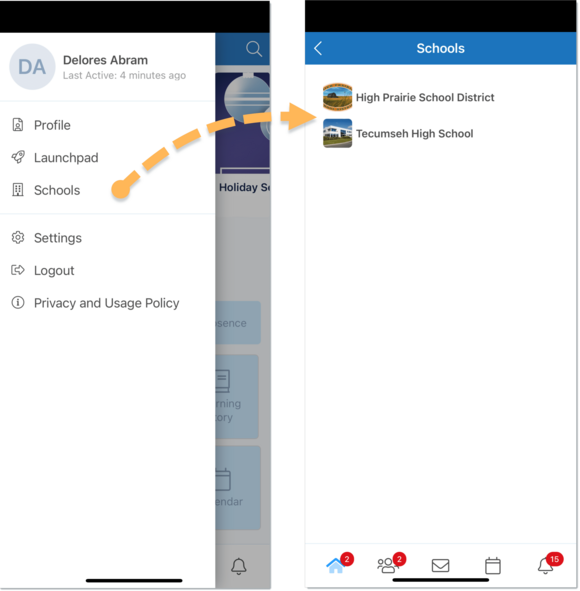 The Edsby Mobile App enables access to the school and district pages of the children associated with parents’ account. To access these, click Schools under the Home Screen drop-down menu. Click the name of a school or district to view its page.