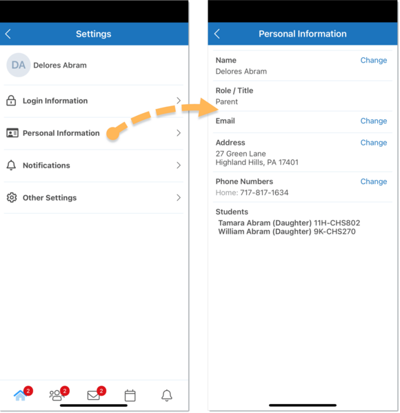 Parents can review their address and phone and other information by selecting Personal Information from the Settings menu. If this information is incorrect or requires changing or updating and cannot be updated here, parents should contact the school. It is often managed by the school in the school’s master systems and synced to Edsby.