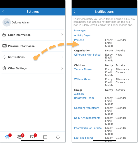 Parents can choose to be notified of various activities in various ways through email, Edsby itself, or Mobile Notifications on mobile through their Account Settings. Edsby notifications are found in Notifications from the navigation bar across the bottom of the screen.