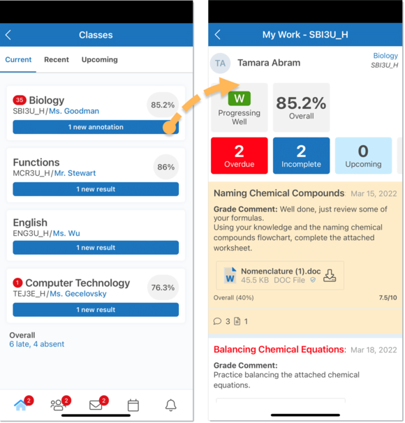 Parents can view their child’s grades in a class by clicking My Work below each Class. From here, parents will see overdue, incomplete, upcoming, ungraded, and graded assessments. Below each assessment listed, parents can see their child’s submissions, a teacher’s private notes and annotations, and grades for that assessment.