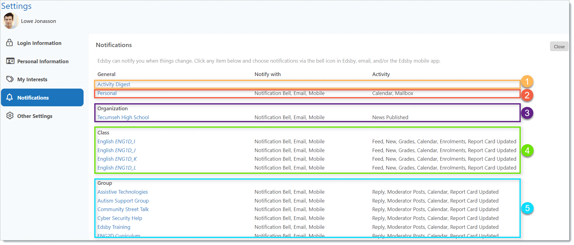 Email notifications are notifications sent to the email associated with a specific Edsby account. For more information on Email Notifications and receiving daily Digest Emails, click here.