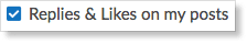 Teachers and students can choose to receive notifications from the Group Feed regarding Replies and Likes on only their posts by clicking the box next to Replies & Likes on my posts. These notifications work just the same as when notified of Likes and Replies on other posts except the notification will specify that the Like or Reply was made on a post.