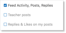 Teachers and students can choose to receive notifications regarding the Group Feed by clicking the box next to Feed Activity, Posts, Replies, Likes. When this is selected, Moderator posts and Replies and Likes on my posts are automatically included, so they are greyed out and do not need to be clicked.