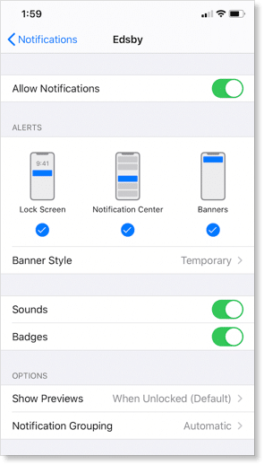 Ensure Mobile Notifications are enabled for the Edsby App by enabling them in the Settings of the mobile device being used to access Edsby on.