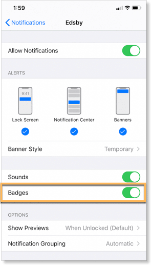 In the device’s settings, enable Badge Notifications to see this red bubble counter on the Edsby App. Note in the current iOS version of the Edsby app, the badge will only indicate the number 1 when there are one or more notifications waiting. This is a known limitation and will be addressed in the future.