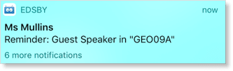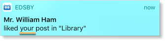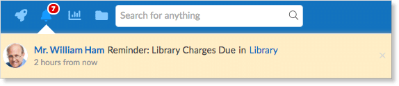 The notification will provide the name of the person who posted it (Mr. William Ham), how long until the event is occurring (2 hours from now), the name of the event (Library Charges Due), and the group in which the post was made (Library).