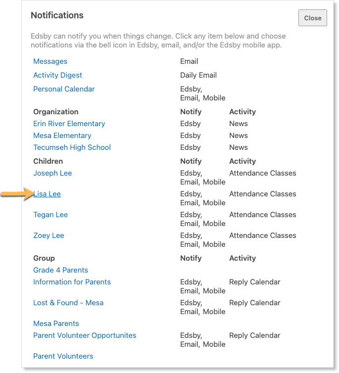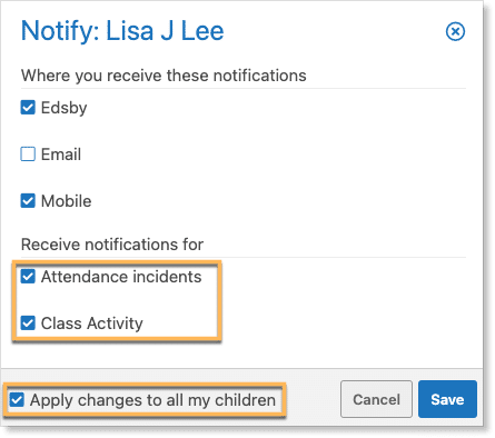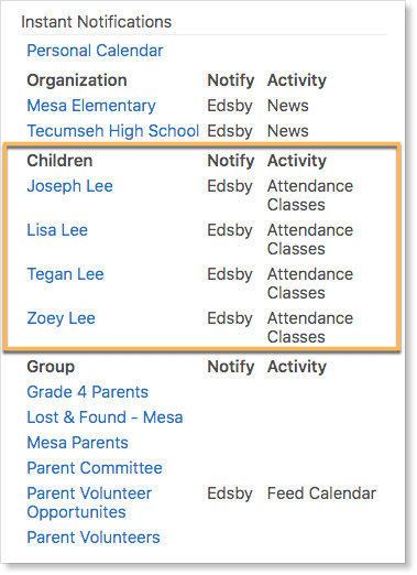 In this example, Sara Lee would like to receive notifications concerning attendance incidents and class activity for all of her children.