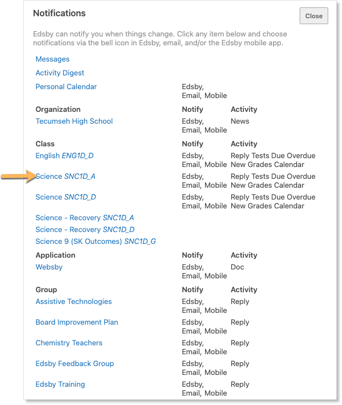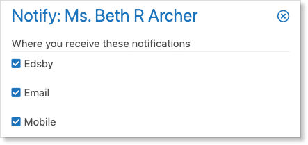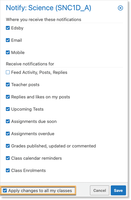 Choose a mode of notification – Edsby, Email, or Mobile – by selecting the boxes under Where you receive these notifications.