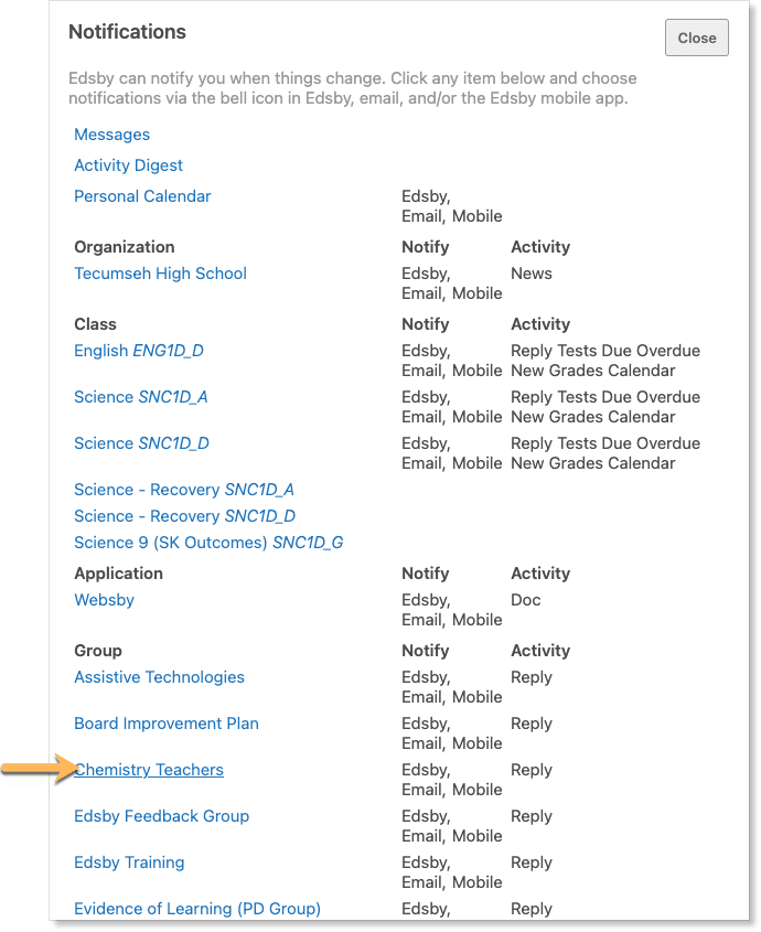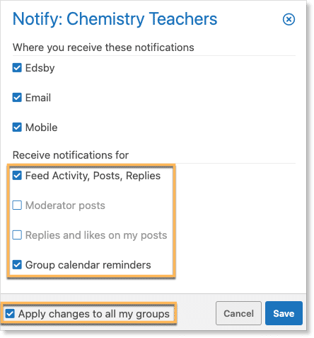 Choose a mode of notification. Edsby can notify teachers and students of four different activities regarding their groups.