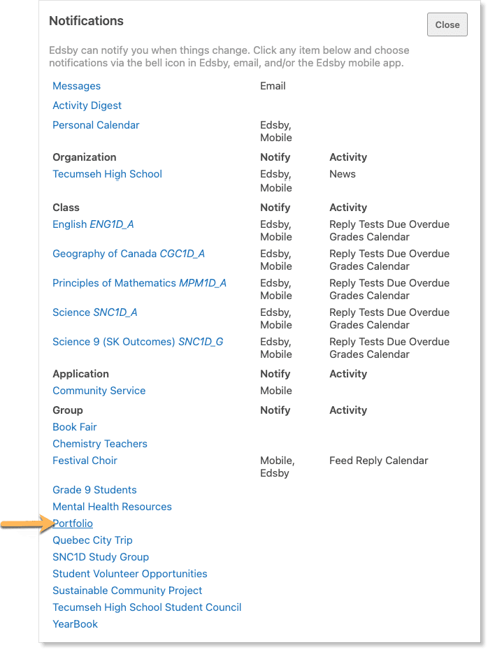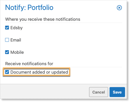 Students have the additional option of choosing to be notified of whenever an item in their Portfolio has been added or updated.![]()